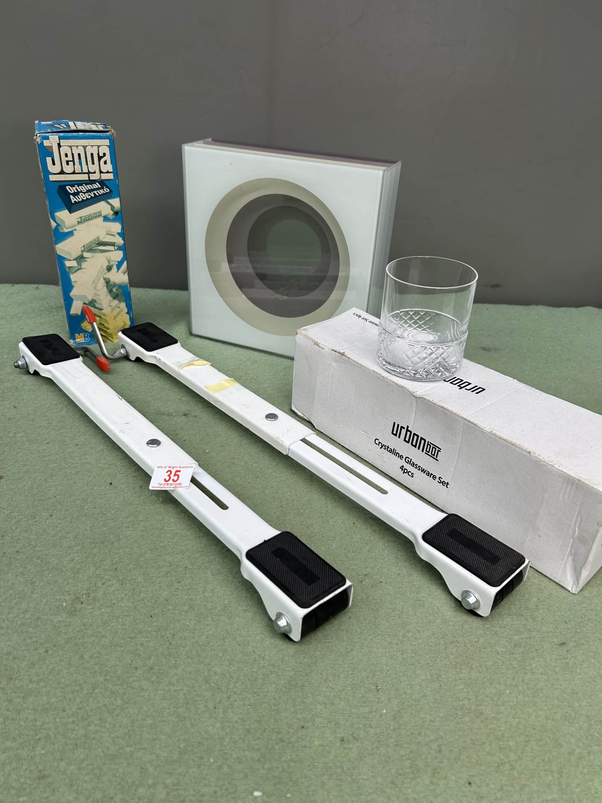 Tilly’s Auction (Part 2)| Item description: | Mixed Lot includes a pair of appliance moving wheels, glasses in box, Jenga and retro habitat vase |