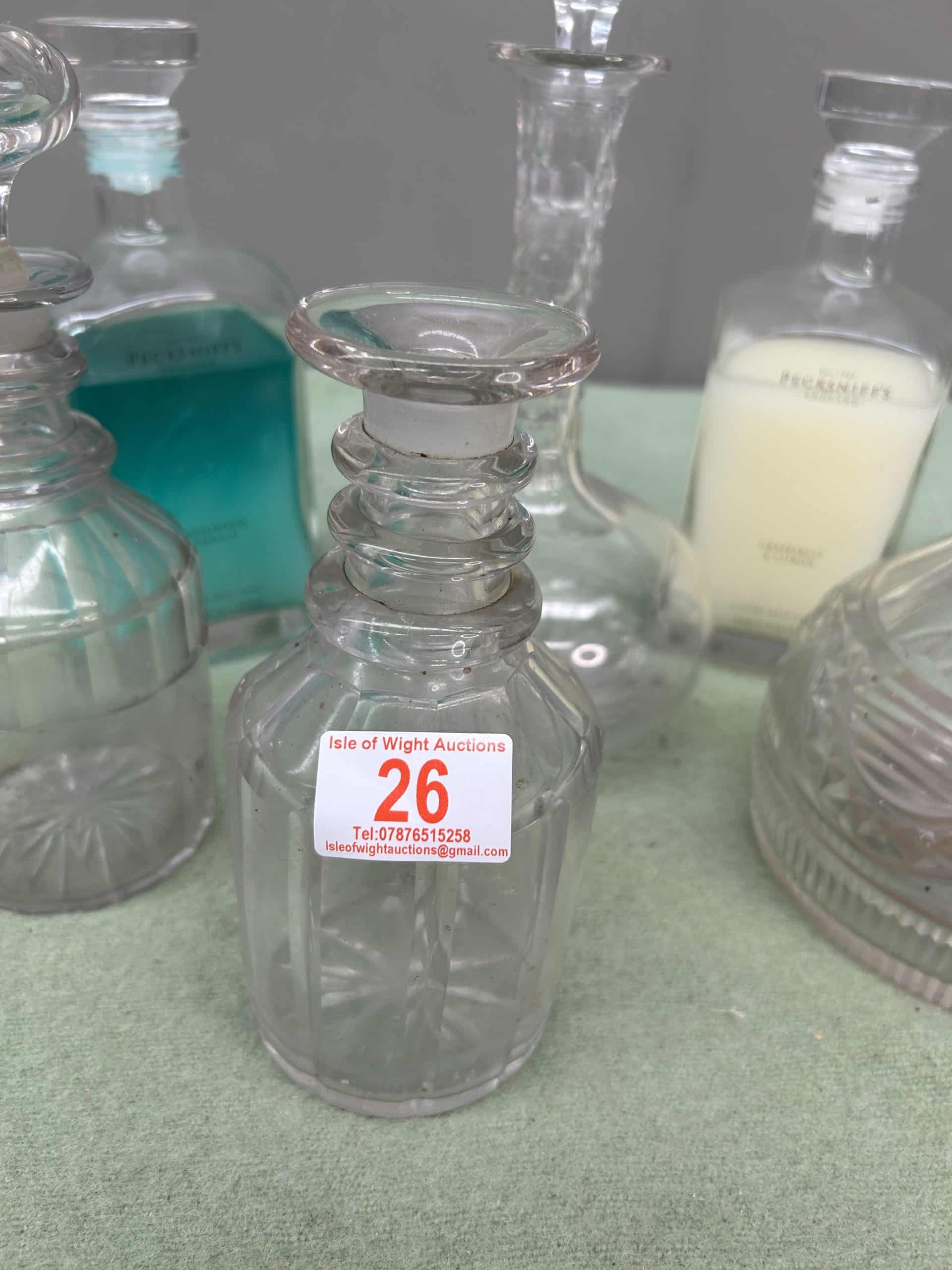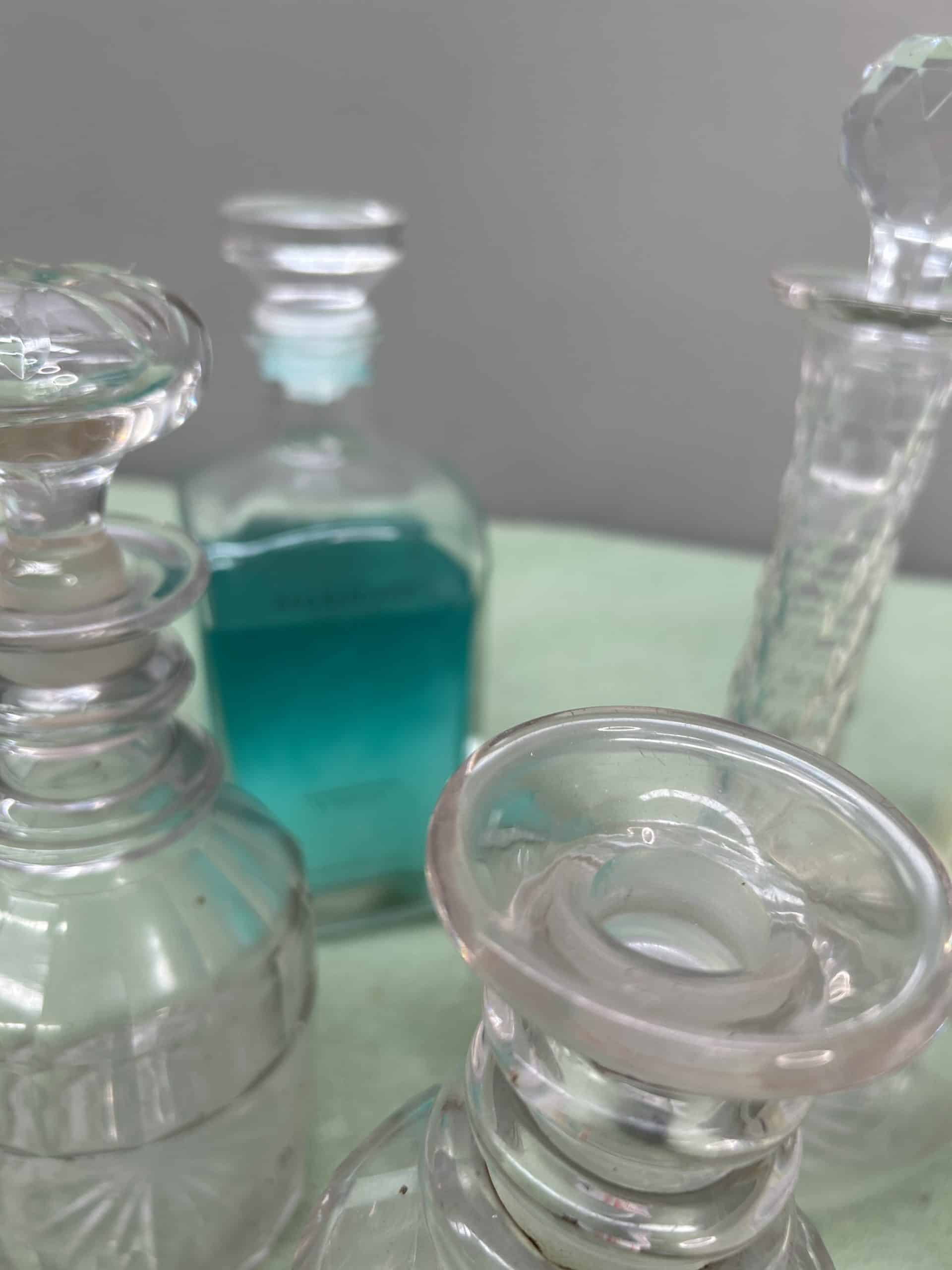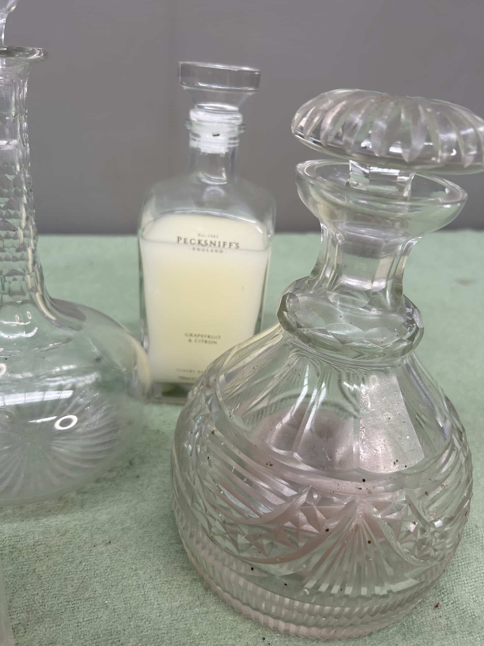 Collection or glassware 6 pieces some cut glass decanters three with stoppers one without plus two glass bottles filled with shampoo & conditioner