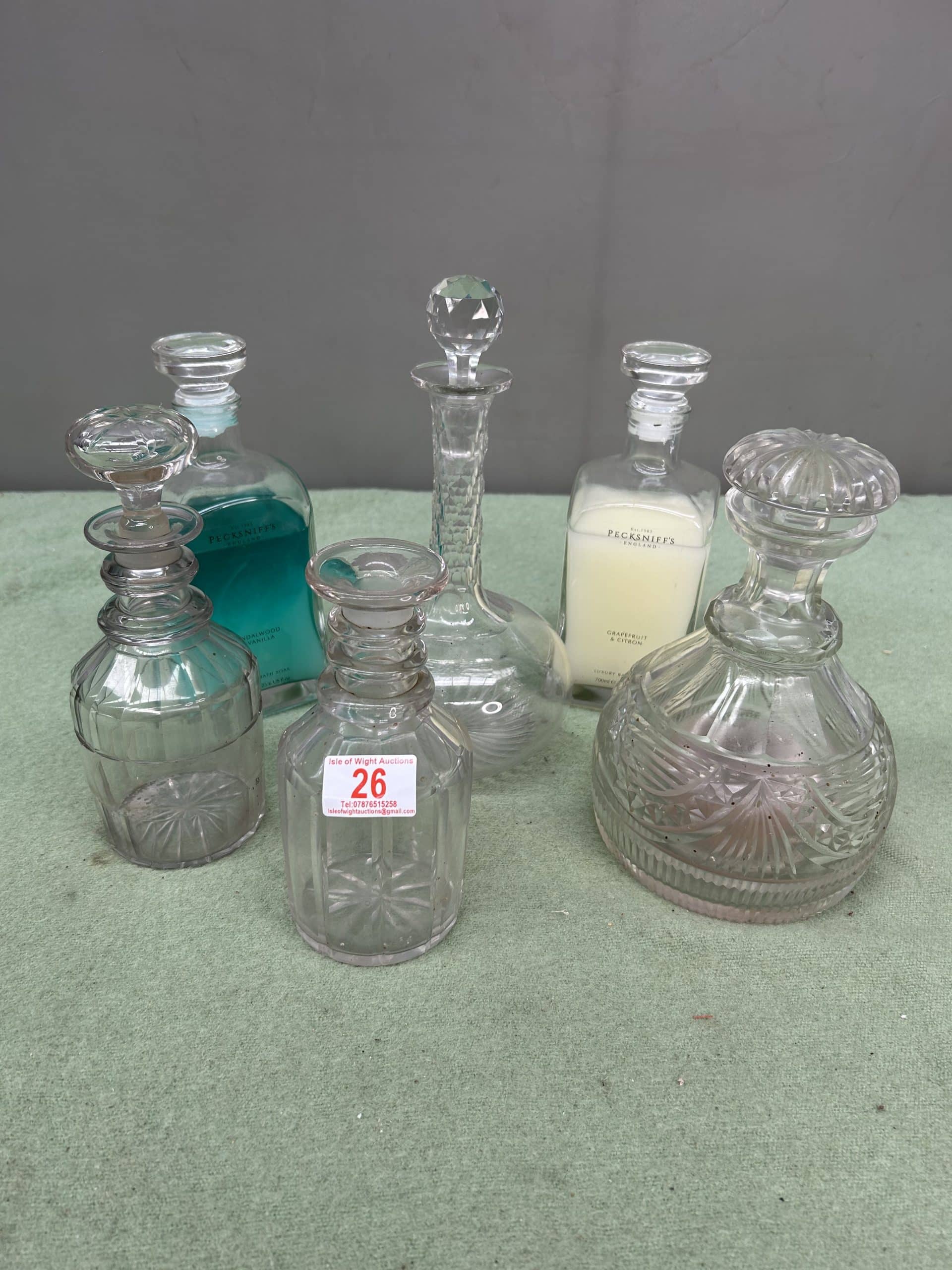 Collection or glassware 6 pieces some cut glass decanters three with stoppers one without plus two glass bottles filled with shampoo & conditioner