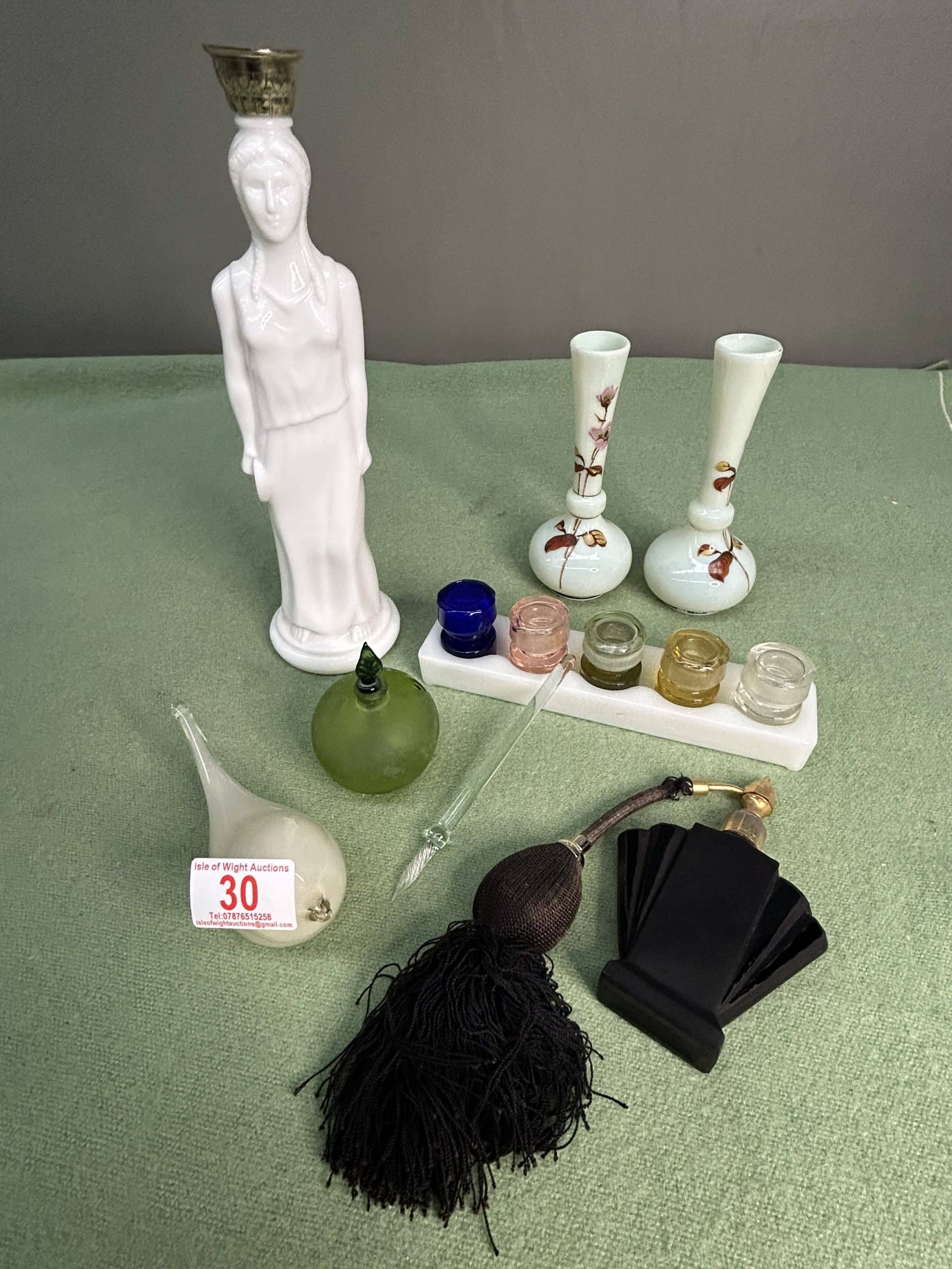 Downsizing Auction| Item description: | Collection of vintage perfume bottles, notably 1969 Avon Greek Lady, plus atomiser bottle with tassels, rack of small glass vials, two posy vases etc |