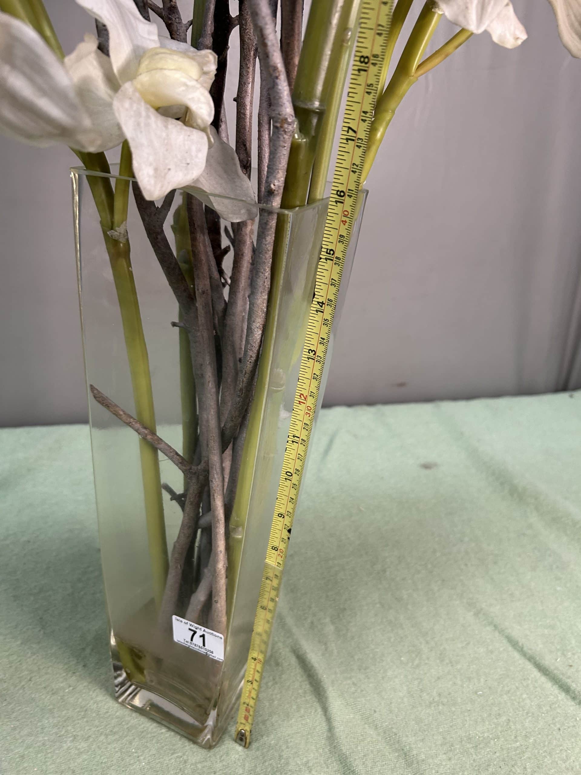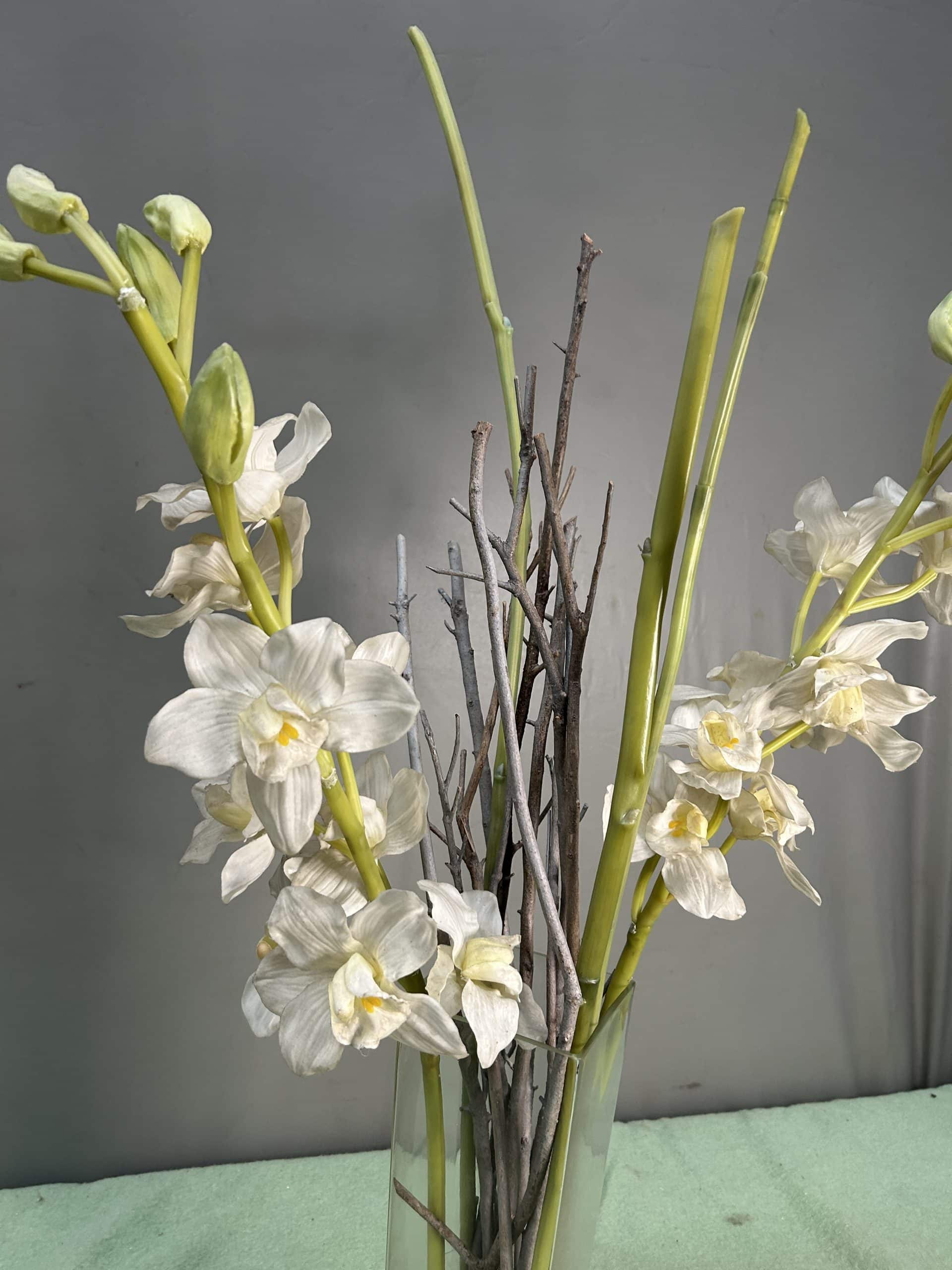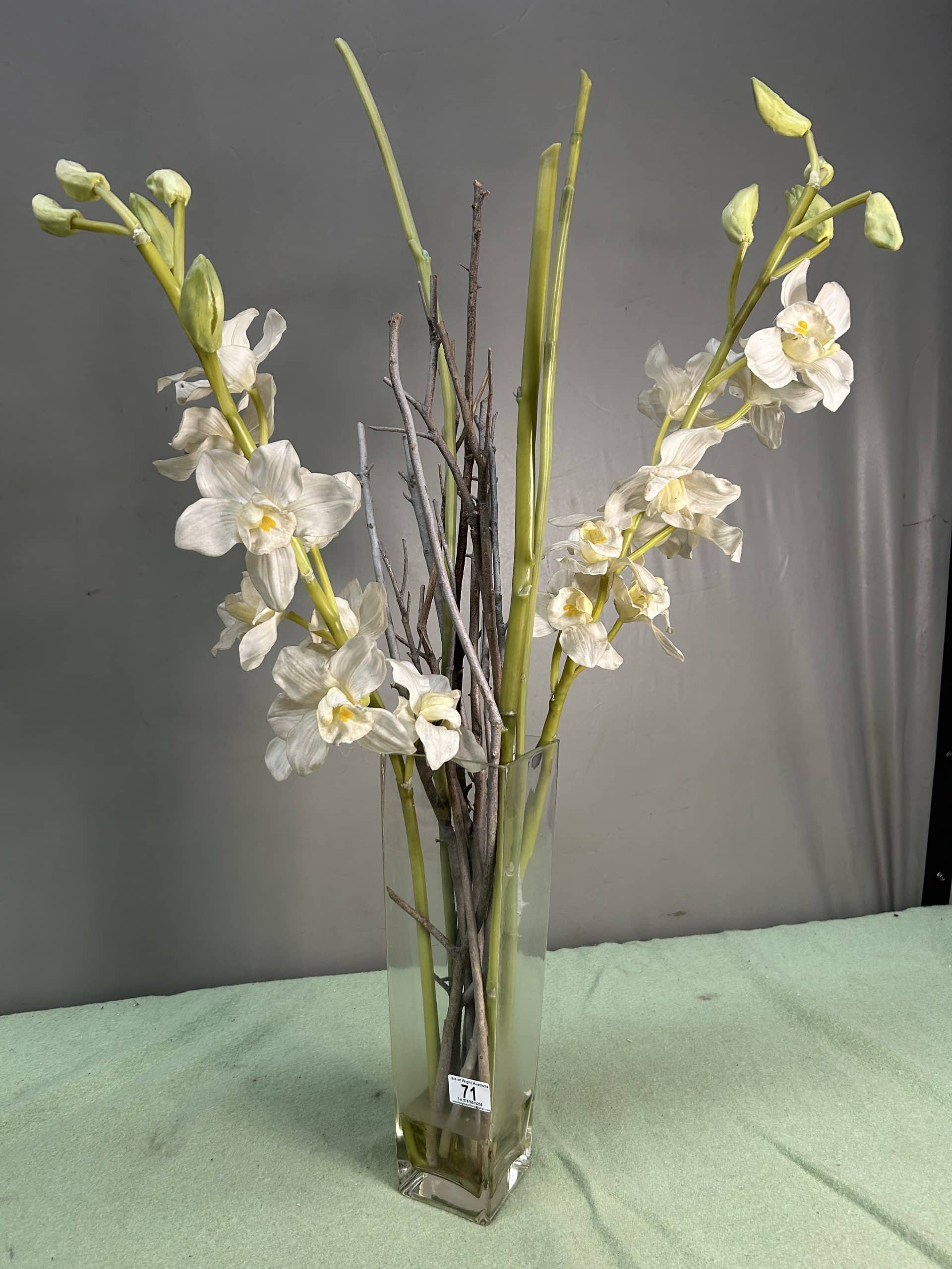 Glass vase with artificial orchids lovely display, photo shows resin in the bottom of the vase to keep stems in place