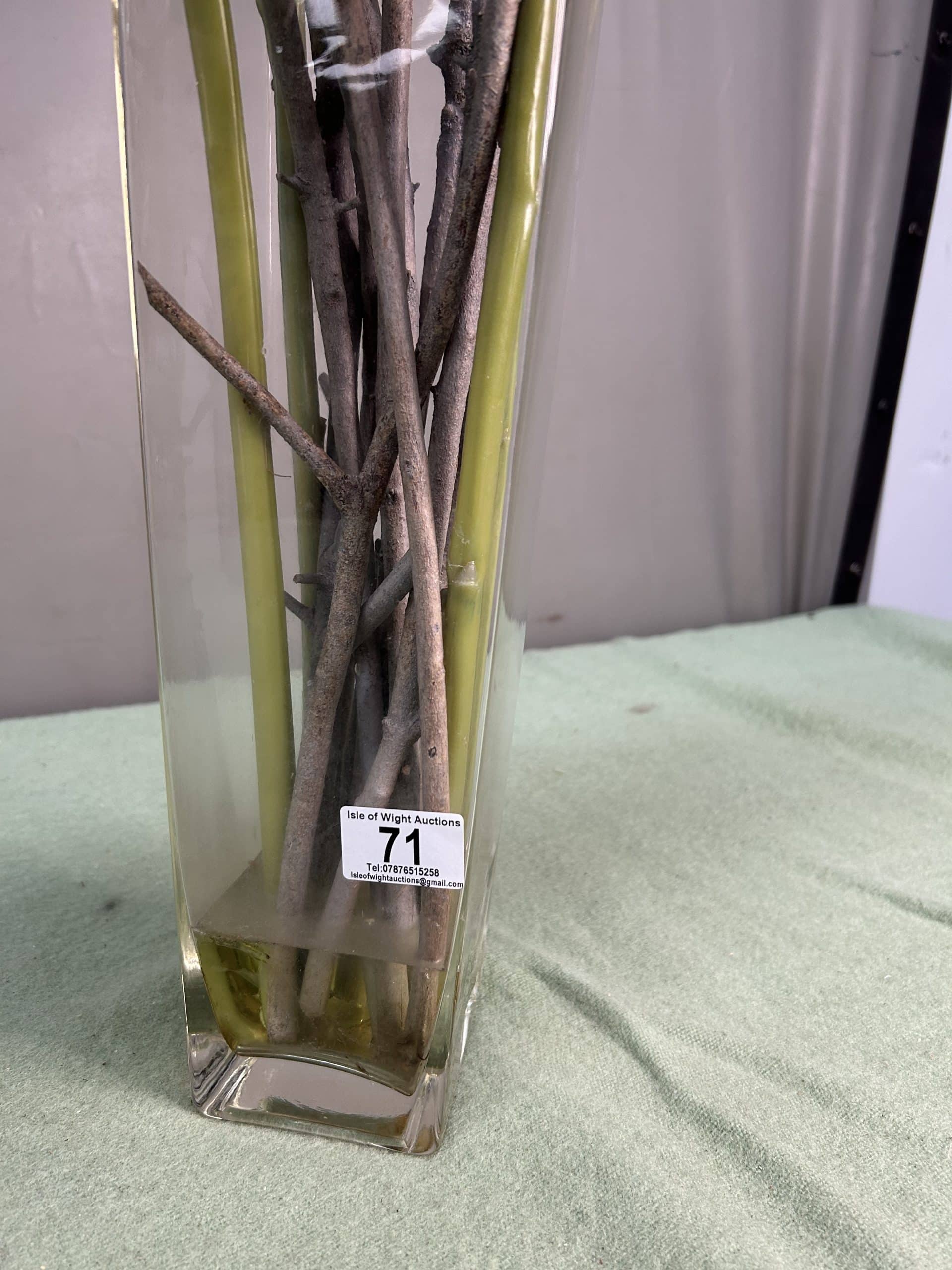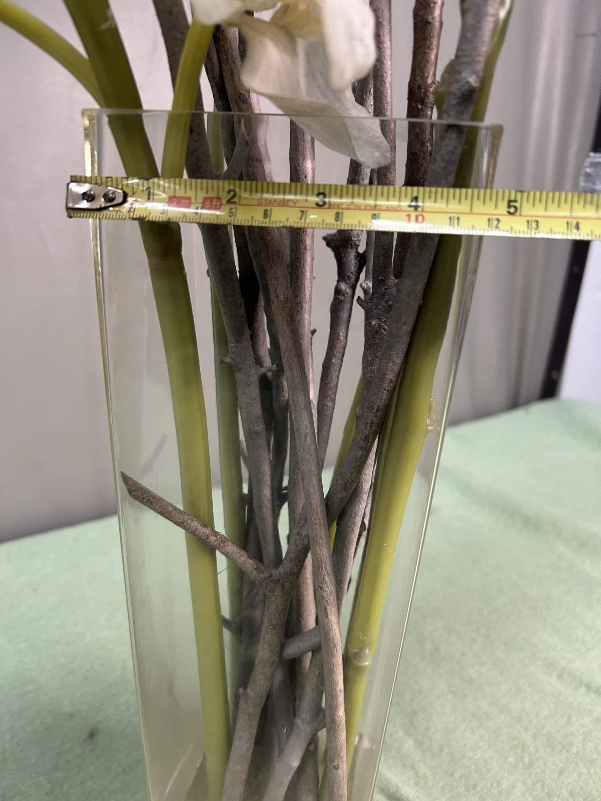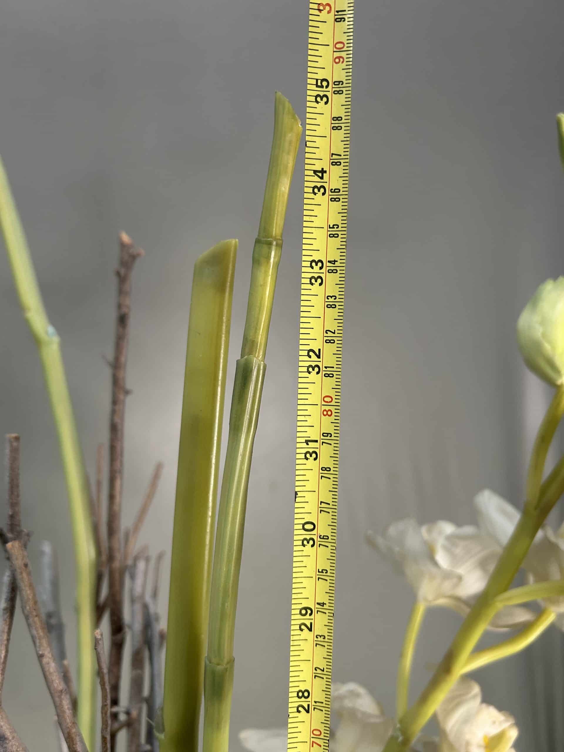Glass vase with artificial orchids lovely display, photo shows resin in the bottom of the vase to keep stems in place