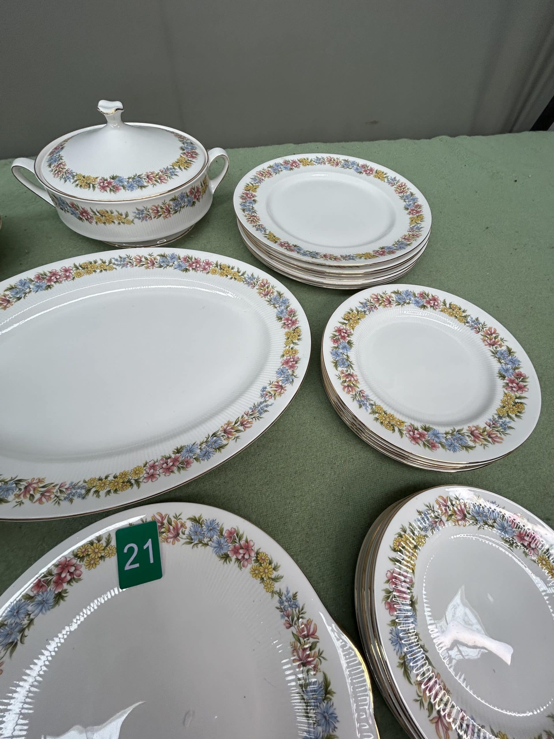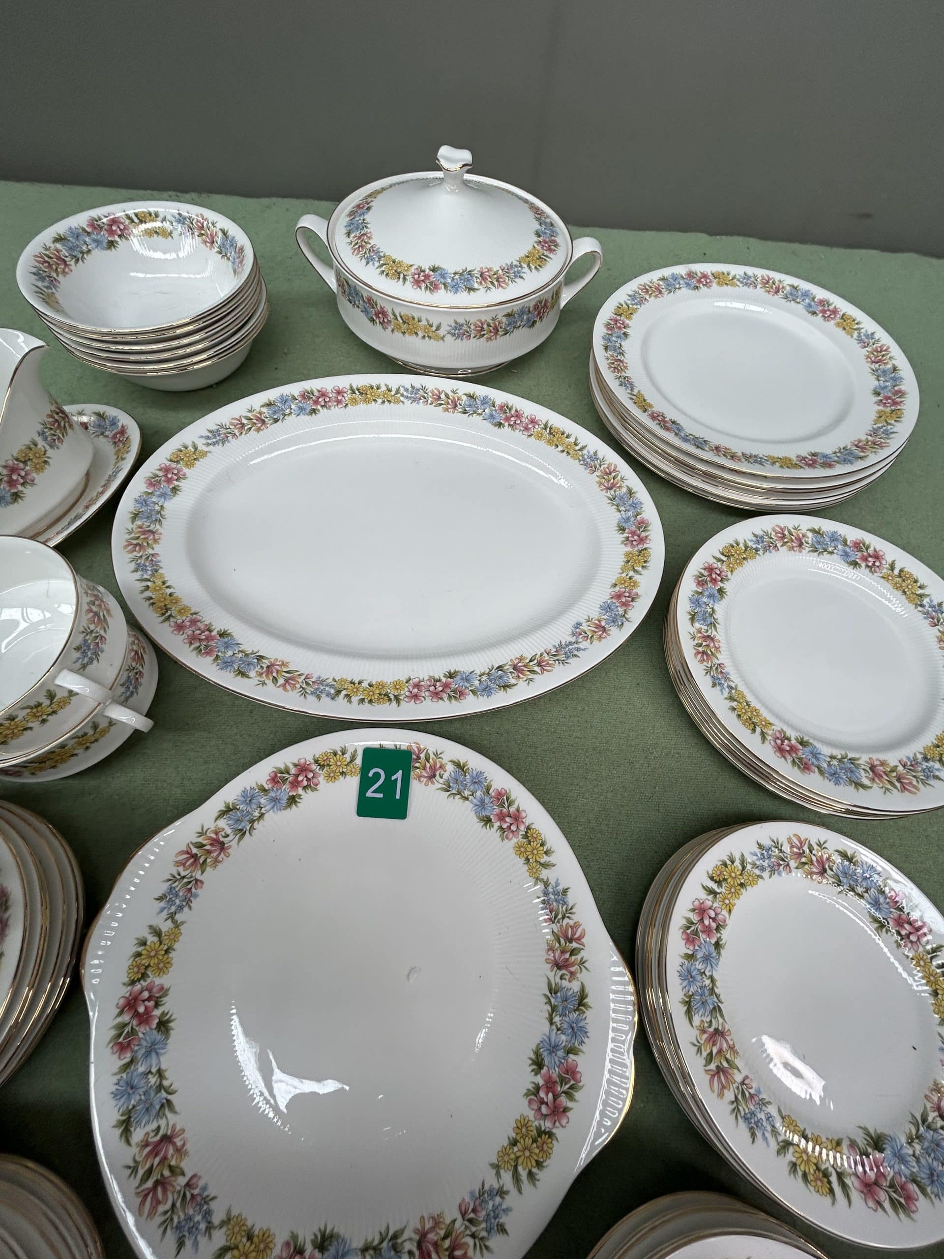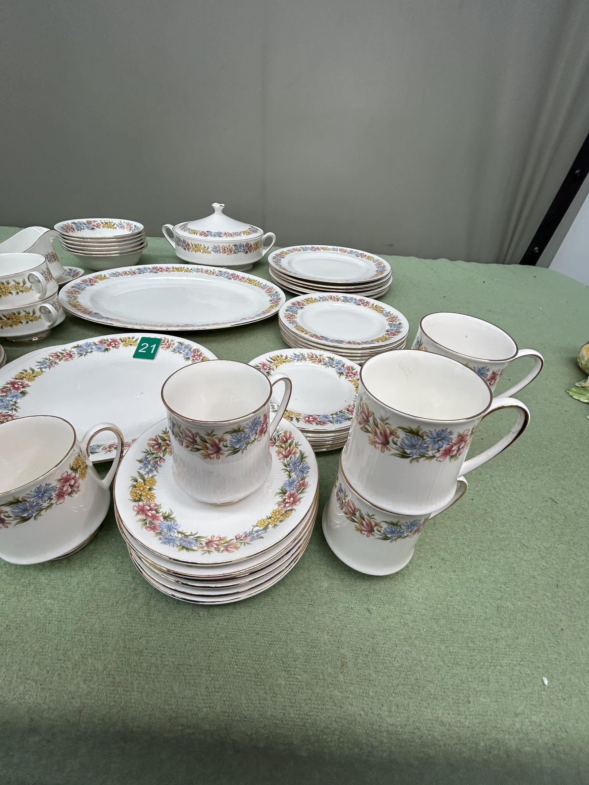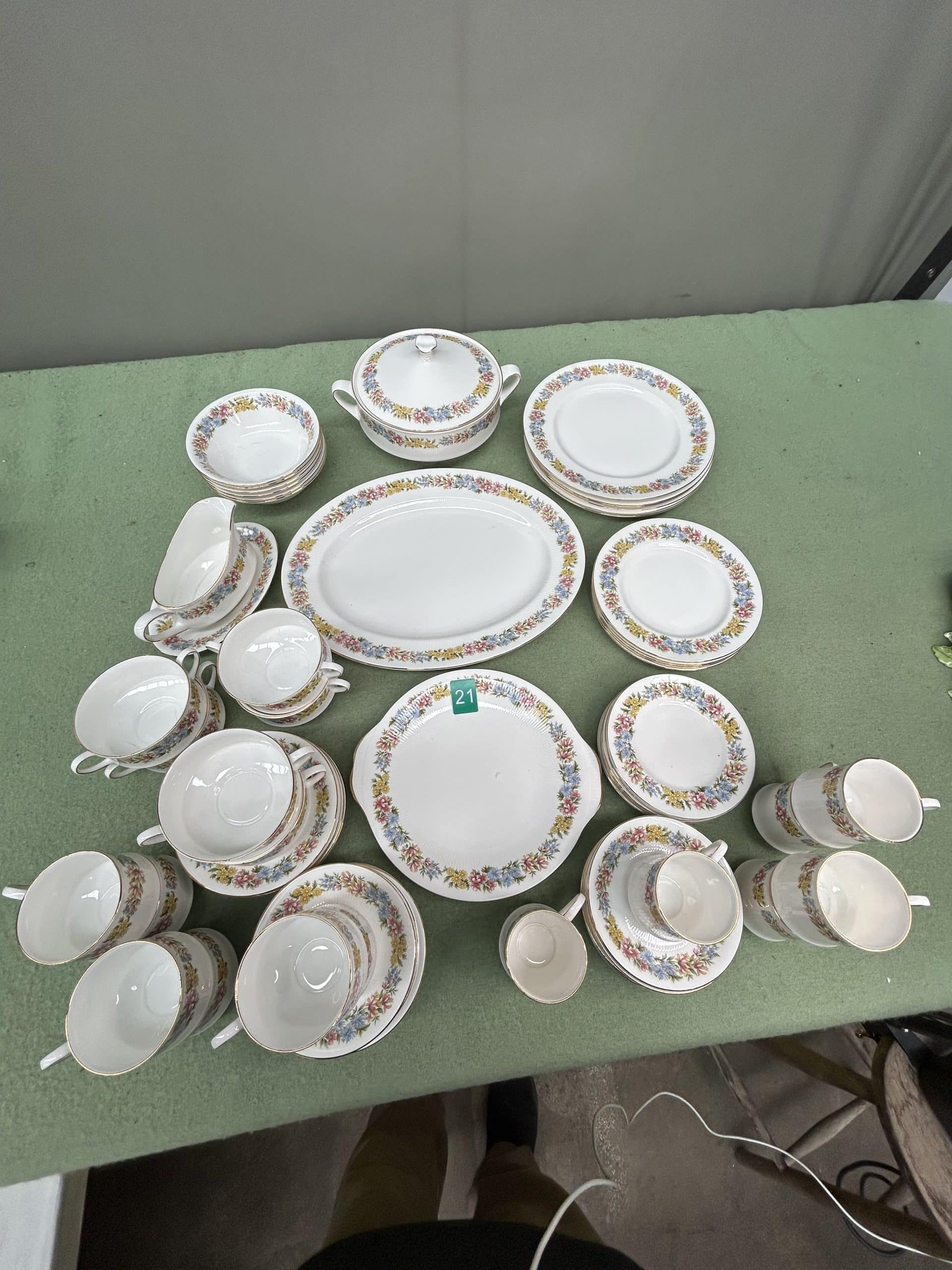 C & E Auction| Item description: | Chinacraft bone china Antoinette dinner set includes plates, side plates, soup bowls, serving dishes, gravy bowl, tureen, cups, saucers and butter plate & knife nice condition full set |