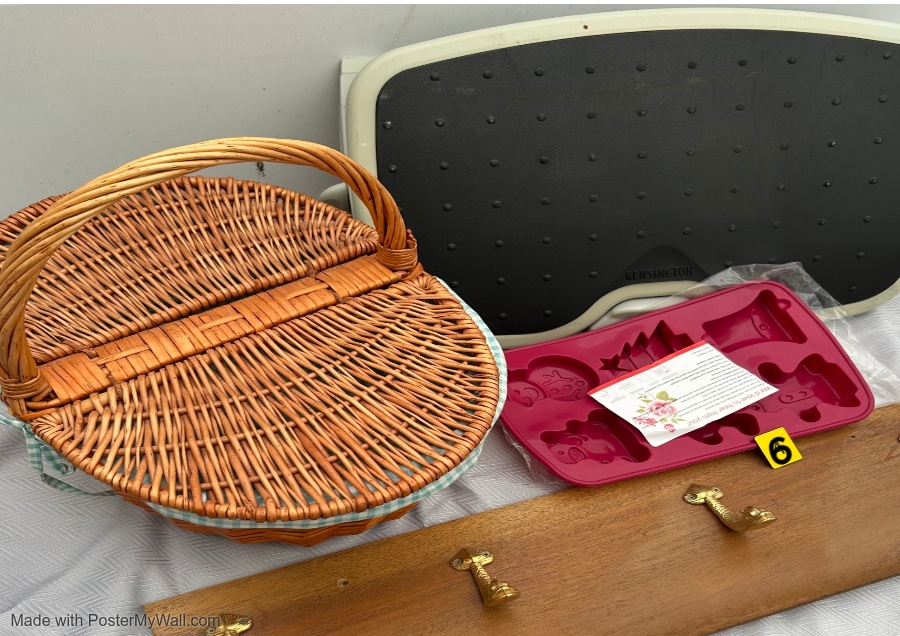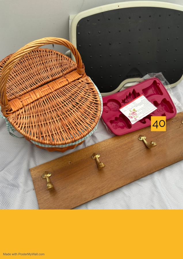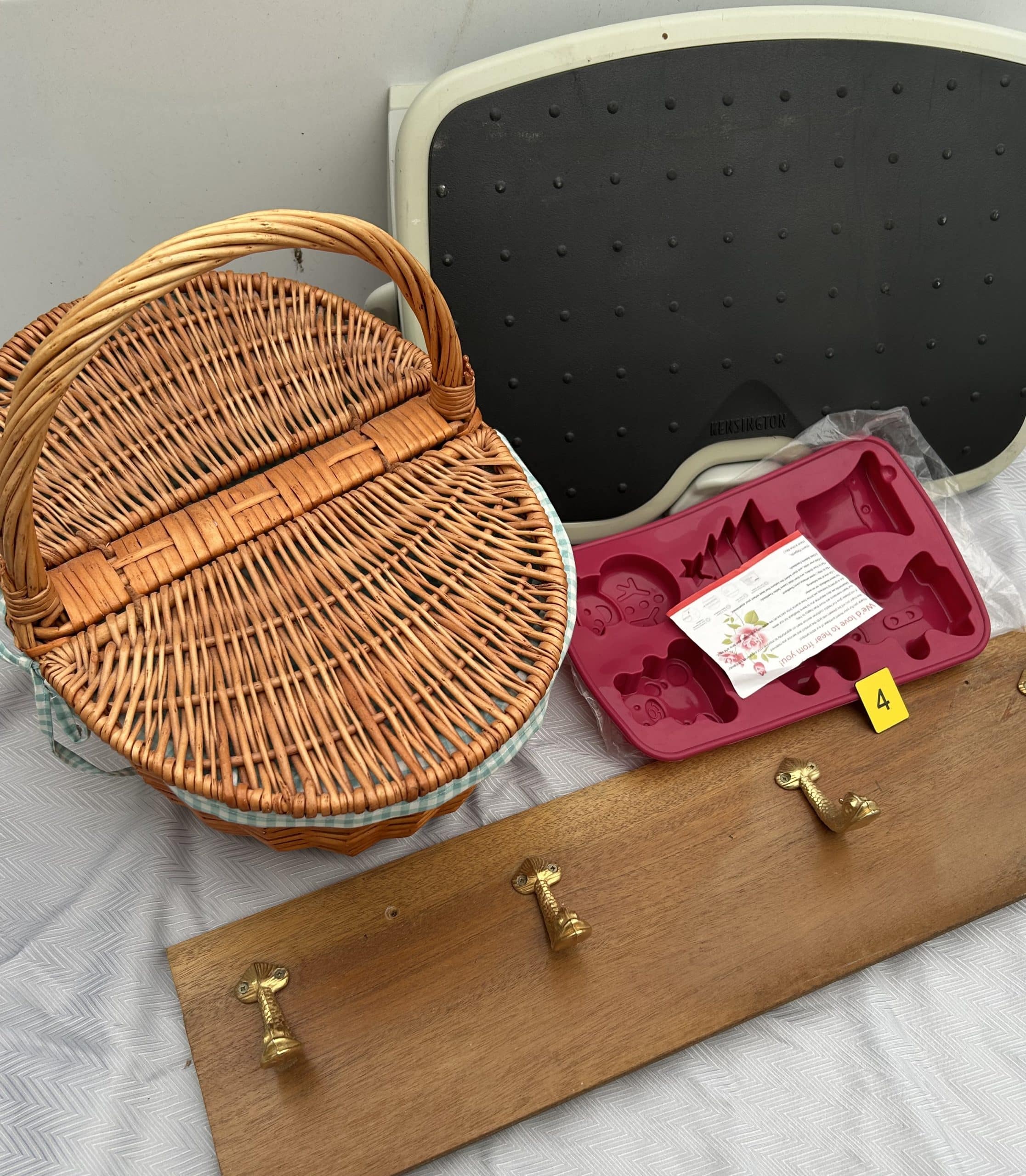 Mixed Lot including woven basket with cover, wooden 4 hanger rack, cooking mould, Foot rest